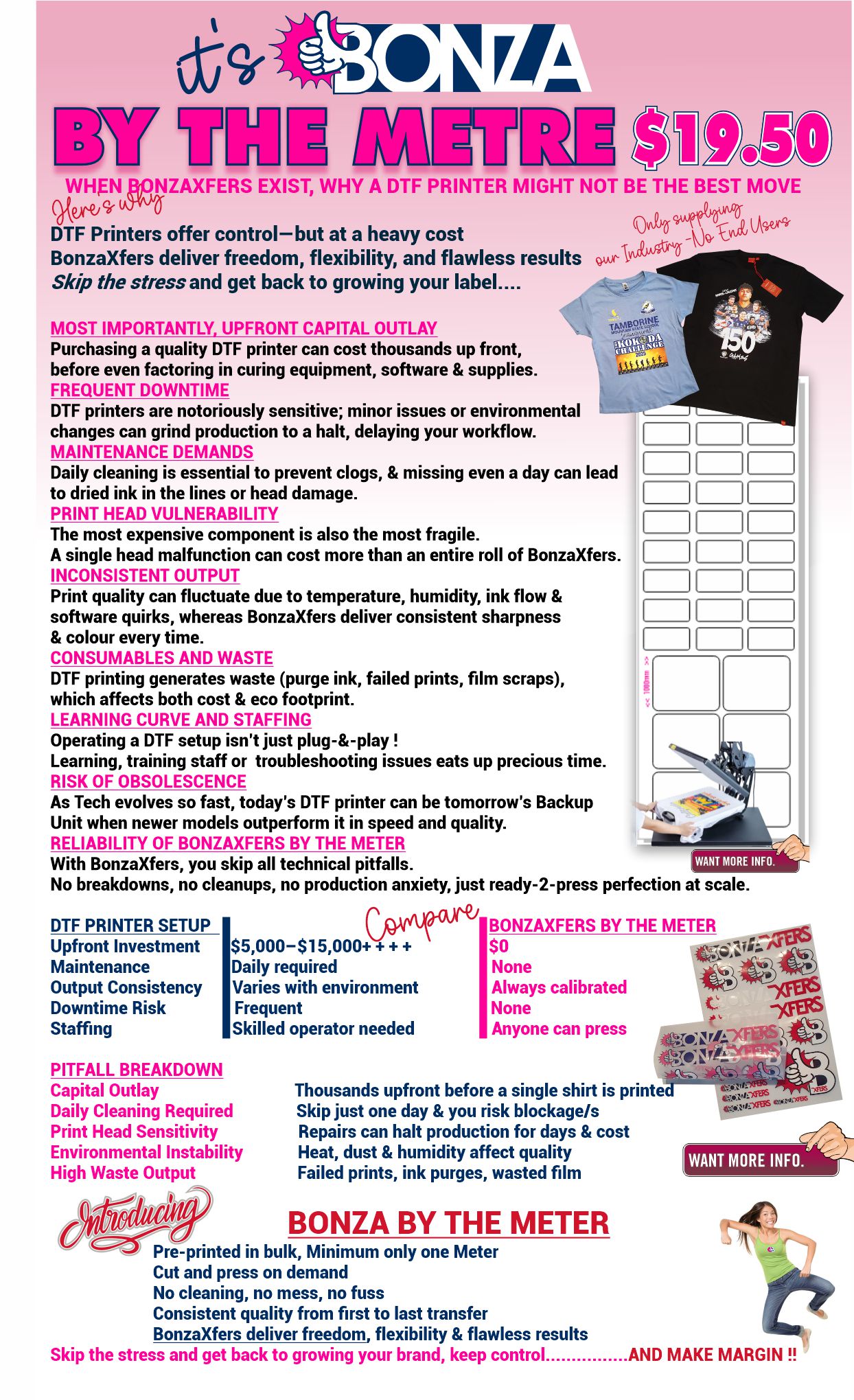 So if your current transfers are cracking under pressure or ghosting your graphics, it’s time to switch to BonzaXfers, the transfer tech that actually gives a damn.